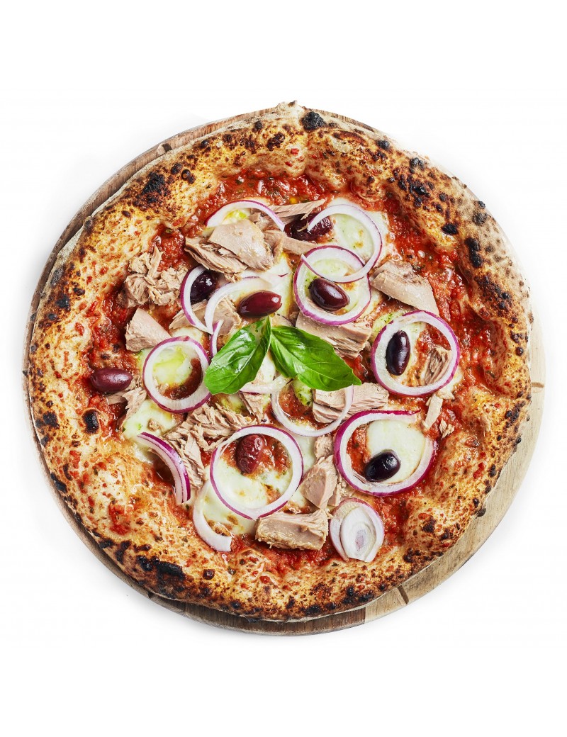 Sauce tomate, mozzarella, thon, oignons rouges, olives noires, basilic, huile d'olive extra vierge