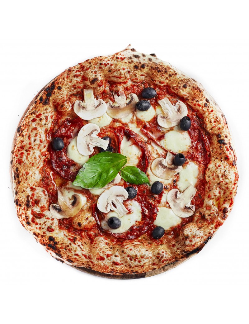 Sauce tomate, mozza, chorizo de boeuf, champignons, olives noires et origan